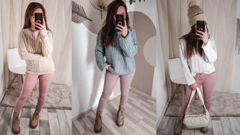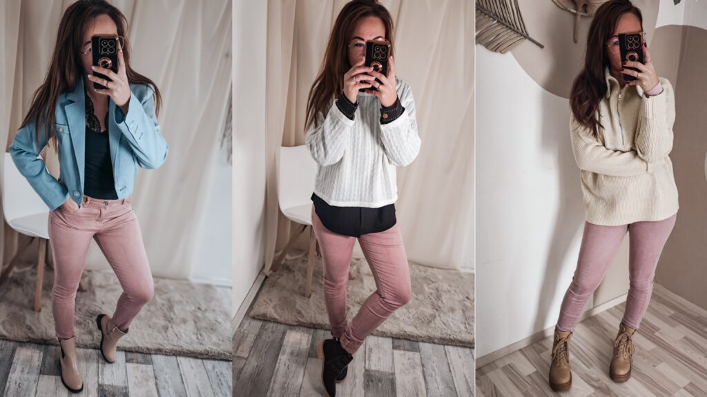 • Klassische Styles für den Alltag: Eine bequeme und dennoch stylische Wahl für den Alltag ist ein Oversized-Shirt oder ein lässiger Pullover zu rosa Jeans. Dazu Sneakers oder Boots – fertig ist der Look!