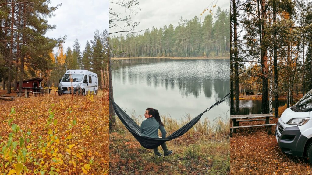 Da die Sonne im Oktober gegen 16:30 Uhr untergeht und wir noch einen Stellplatz suchen wollten, machten wir uns auf den Weg zurück zum Camper. Zum Abendessen gab es heute Folienkartoffeln, im offenen Feuer gebacken. Und nach unseren Recherchen zufolge, würden wir heute Polarlichter sehen, als stieg die Vorfreude auf den heutigen Abend. Wir suchten uns ein schönes Plätzchen am See, richteten dort ein kleines Lager ein und genossen die Ruhe. Leider blieb die Polarlichter-Suche spät am Abend erfolglos, da der Himmel stark bewölkt war.