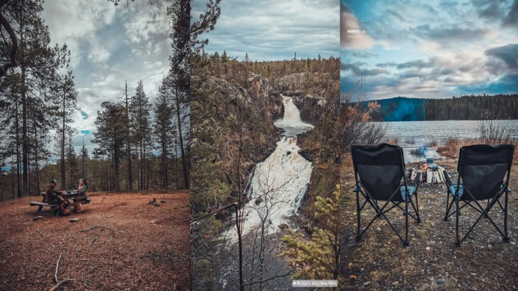 Wir fuhren weiter zum Nationalpark Muddus in Lappland. In diesem Naturreservart erwartete uns Moor-Landschaften, alte Wälder, tiefe Schluchten und Wasserfälle. Wir haben uns wieder für eine 14km lange Route entschieden. Über einige Holzstege, die uns hinauf und hinab durch Hügel führten, erreichten wir nach 2,5 Stunden den großen Muddusfall. Die Geräuschkulisse war überwältigend und ließ die Wucht des Wassers erahnen.